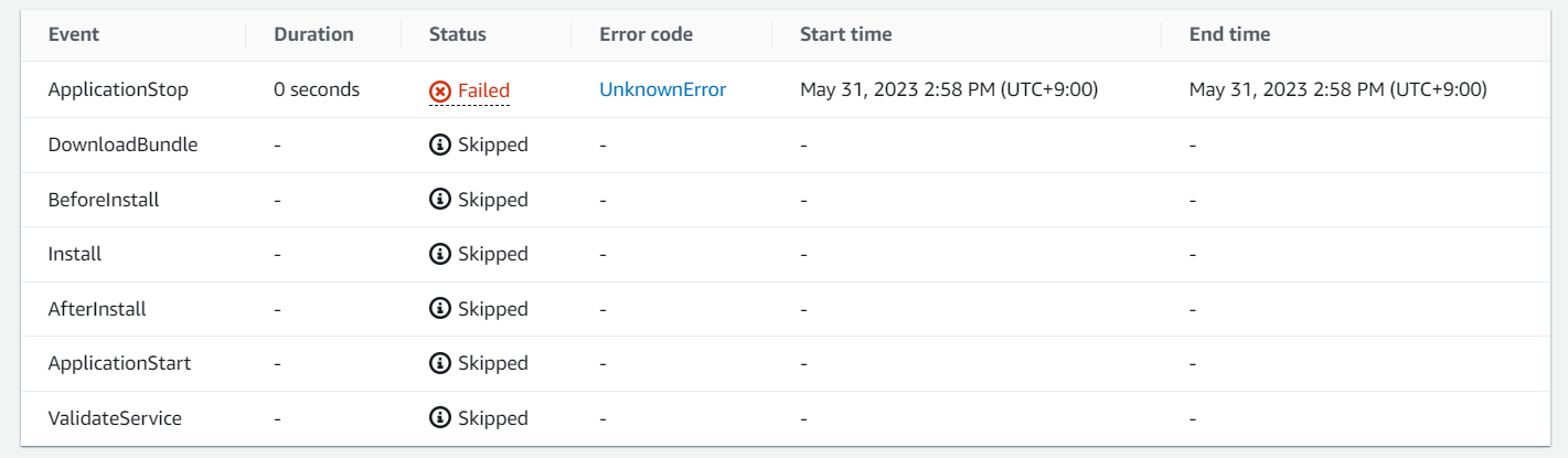 CICD 구축을 위해 CodeDeploy를 Github Actions와 연동시켰습니다. 그런데, 자꾸 ApplicationStop Event 단에서 실패하는 것입니다. 원인을 분석하기 위해 CodeDeploy log를 열어보았습니다.